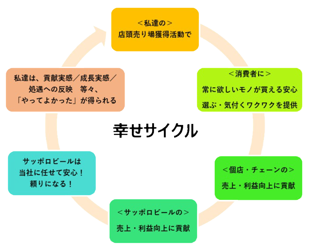 私たちのお客様との接点創りによって、お客様・取引先・サッポロビール・私たち社員一人ひとりの幸せサイクルをグルグルと永続的に回し続けられるよう、いま私たちが取り組んでいるビジョン・行動指針は、以下の通りです。